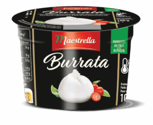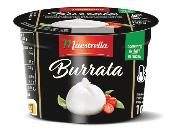 Fleuron de la cuisine italienne, la Burrata congelée Maestrella est un fromage italien traditionnel fabriqué à la main au coeur de la région des Pouilles, dans le sud-est de l’Italie. Élaborée à partir de lait de vache dans la pure tradition, c’est un fromage à pâte filée avec une enveloppe de mozzarella et un coeur crémeux fondant et très gourmand.