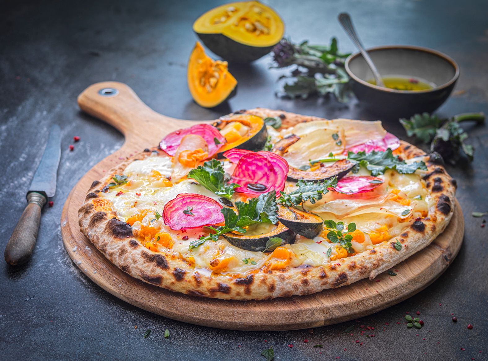 Détailler le potiron en cubes et en quartiers, réaliser de fines lamelles de panais et de betterave à la mandoline. Arroser d’un filet d’huile d’olive, assaisonner, parsemer d’origan et enfourner 10 min.
