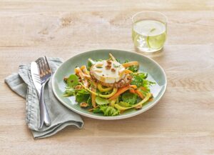 Dresser la roquette et les tagliatelles de carottes dans les assiettes, ajouter le toast de chèvre rôti, parsemer de noisettes concassées, verser un filet d’huile de noix.