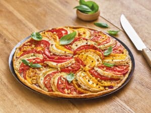 Disposer sur la pâte feuilletée les demi-tranches de tomates et de fromage de chèvre, ajouter l’huile d’olive, les pignons de pin et les herbes aromatiques. Enfourner 30 minutes.